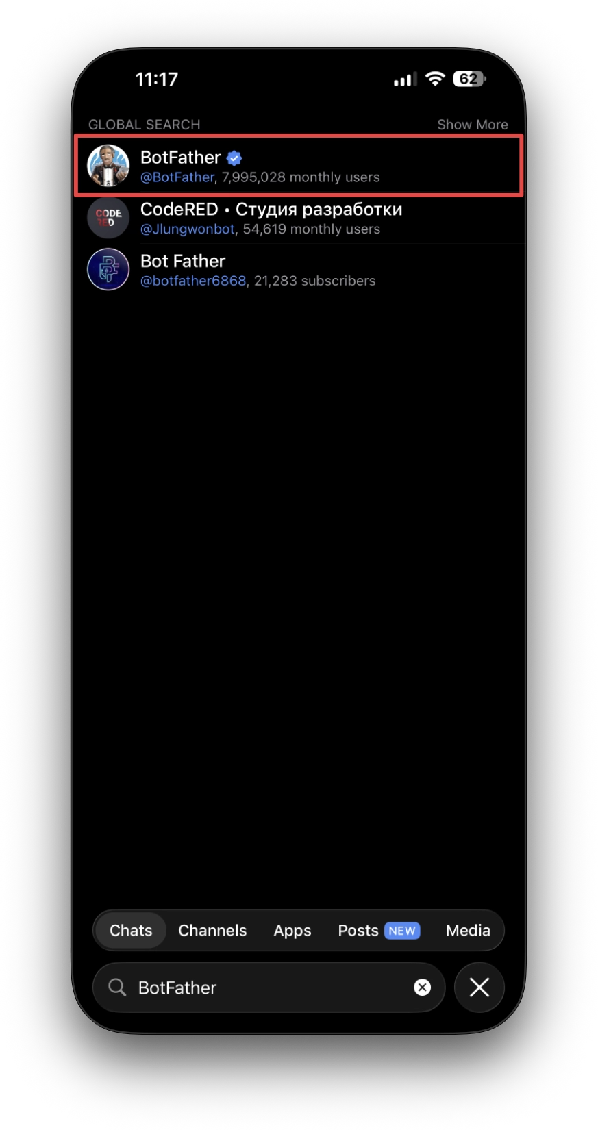- 画面下部の検索バー(虫めがねアイコン)をタップして、「BotFather」と入力します。検索結果に青いチェックマーク付きの「BotFather」が表示されるので、それをタップしてチャット画面を開きます。もし検索で見つからない場合は、ブラウザで https://t.me/BotFather にアクセスすると、直接 BotFather のチャットを開けます。