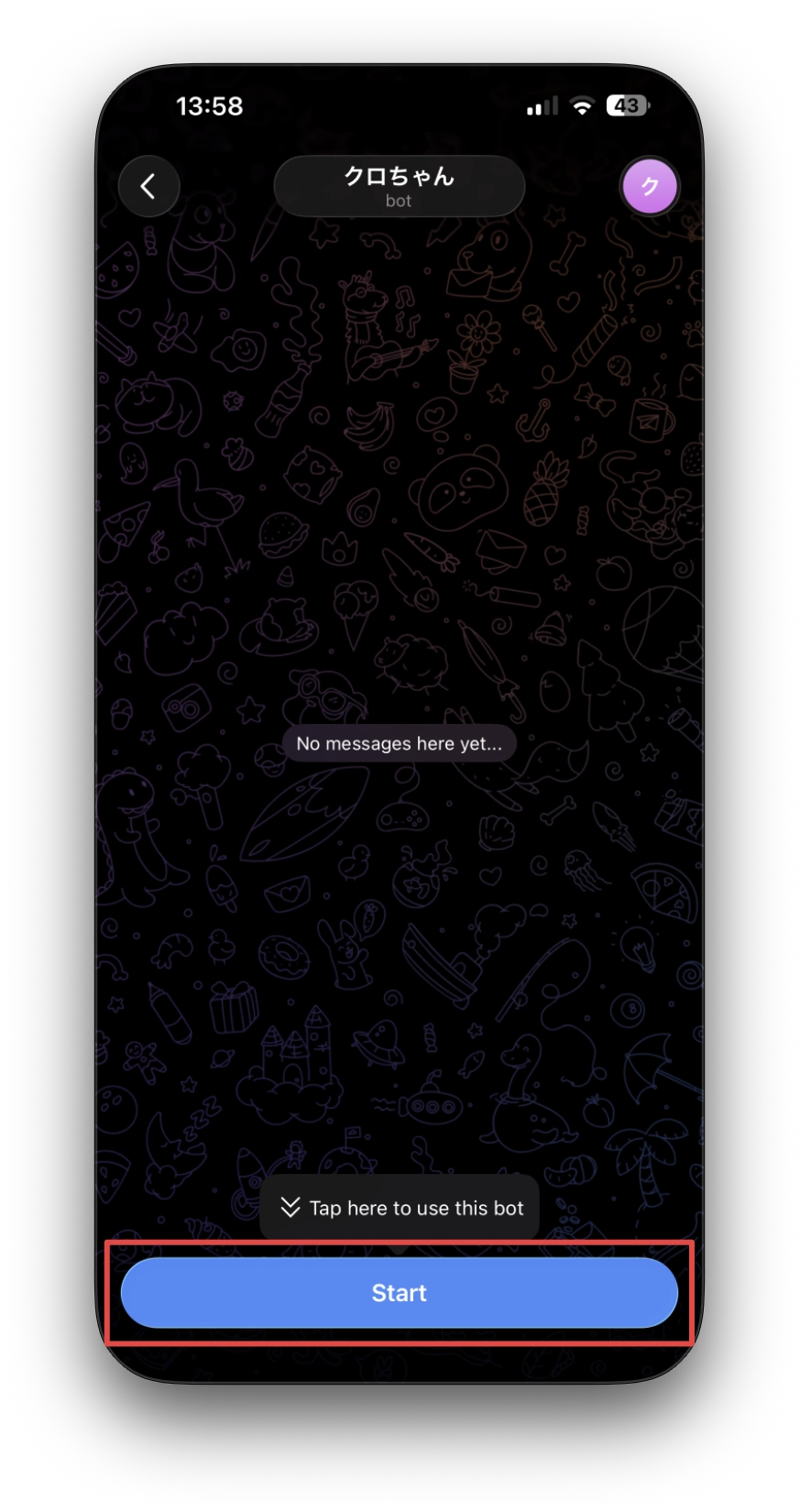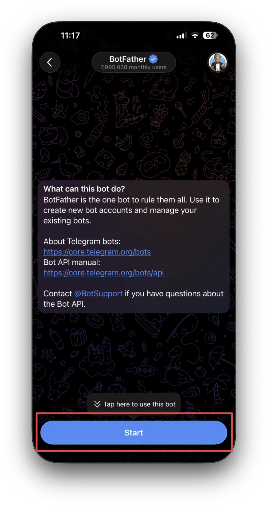 - BotFather とのチャットを開いたら、Start ボタンをクリックして