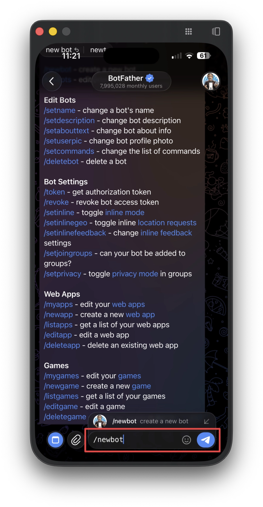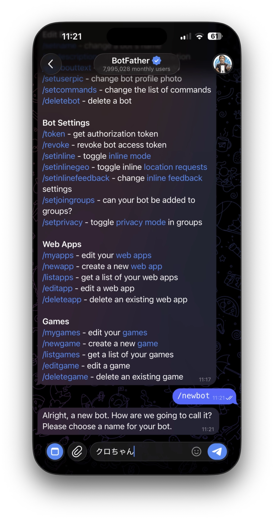 /newbotとメッセージを送信します。
