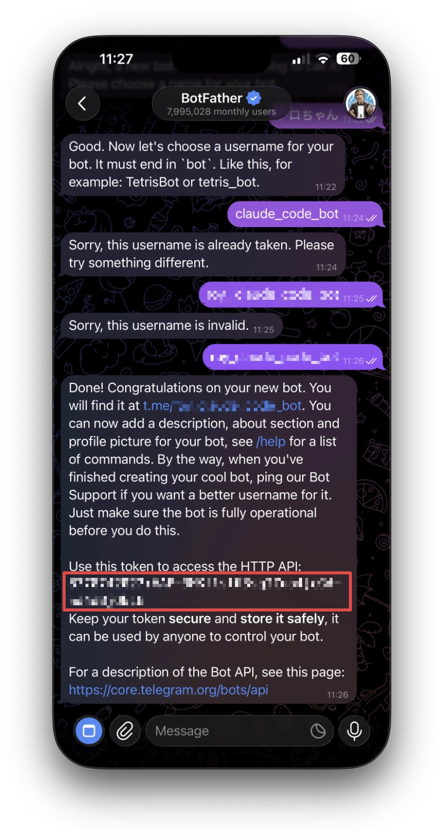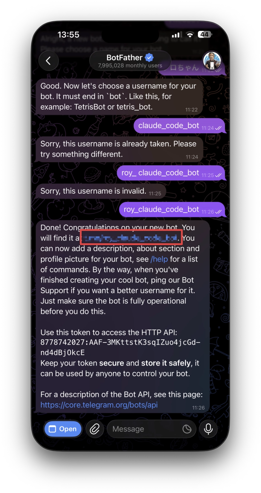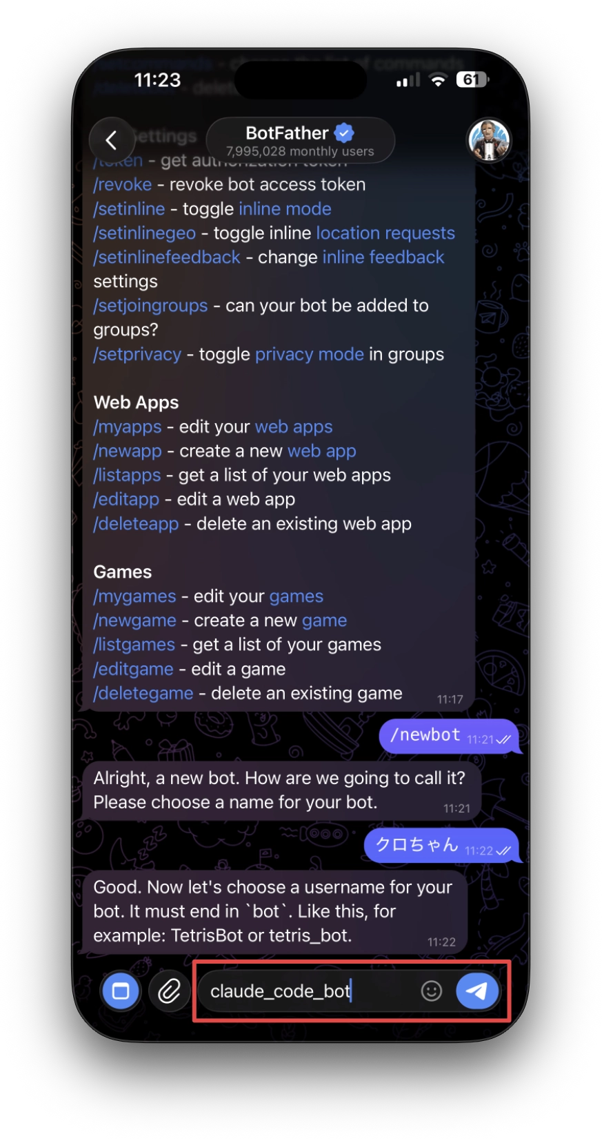 botで終わる必要があります(例:my_claude_code_bot)。
