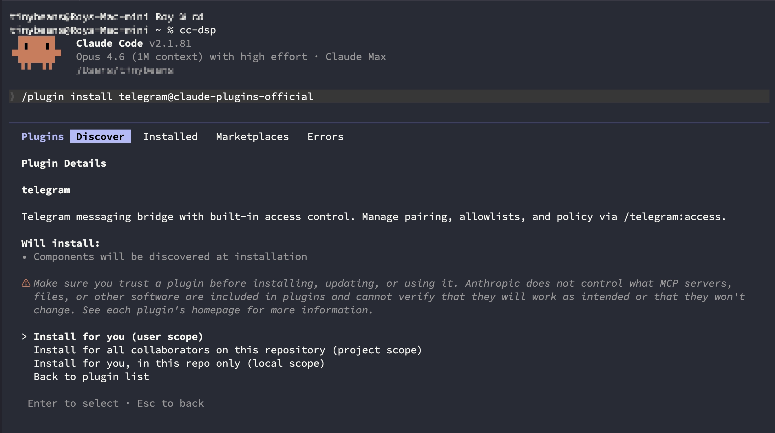 /plugin install telegram@claude-plugins-official