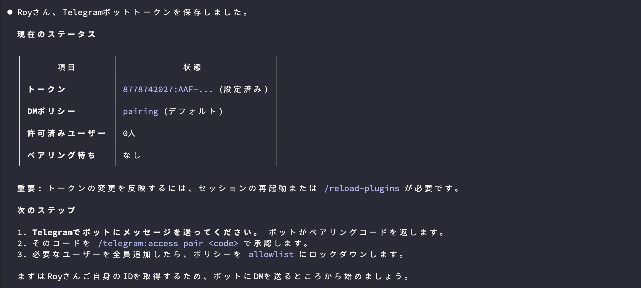 これで、自分の Telegram アカウントだけが Claude Code にメッセージを送れる状態になりました。
