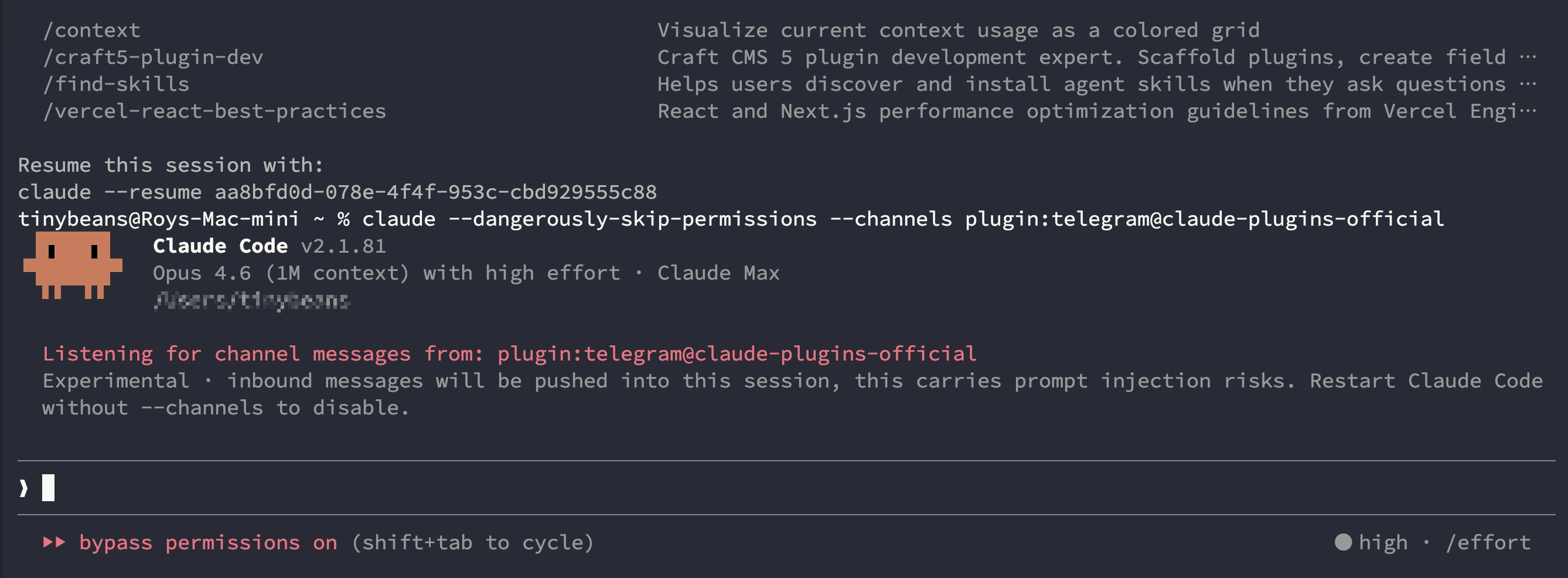 claude --dangerously-skip-permissions --channels plugin:telegram@claude-plugins-official