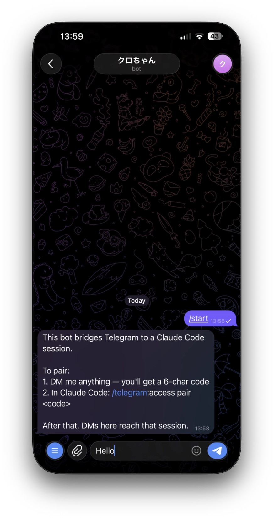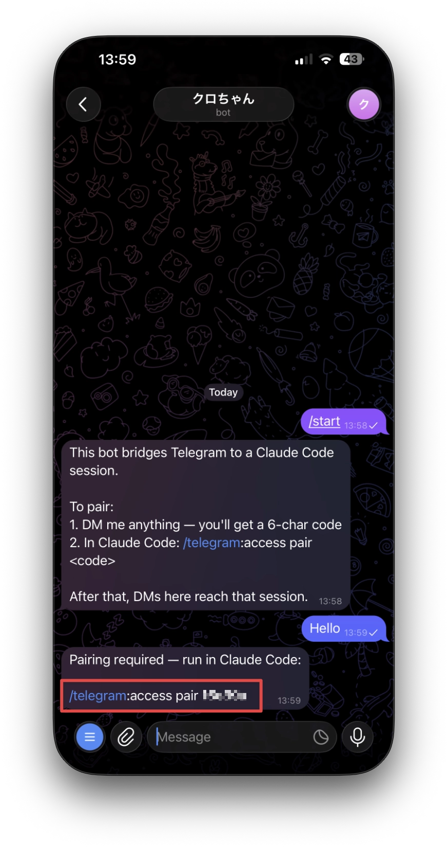 セキュリティのために、最初に自分の Telegram アカウントと Claude Code セッションを紐づけ(ペアリング)する作業が必要です。
