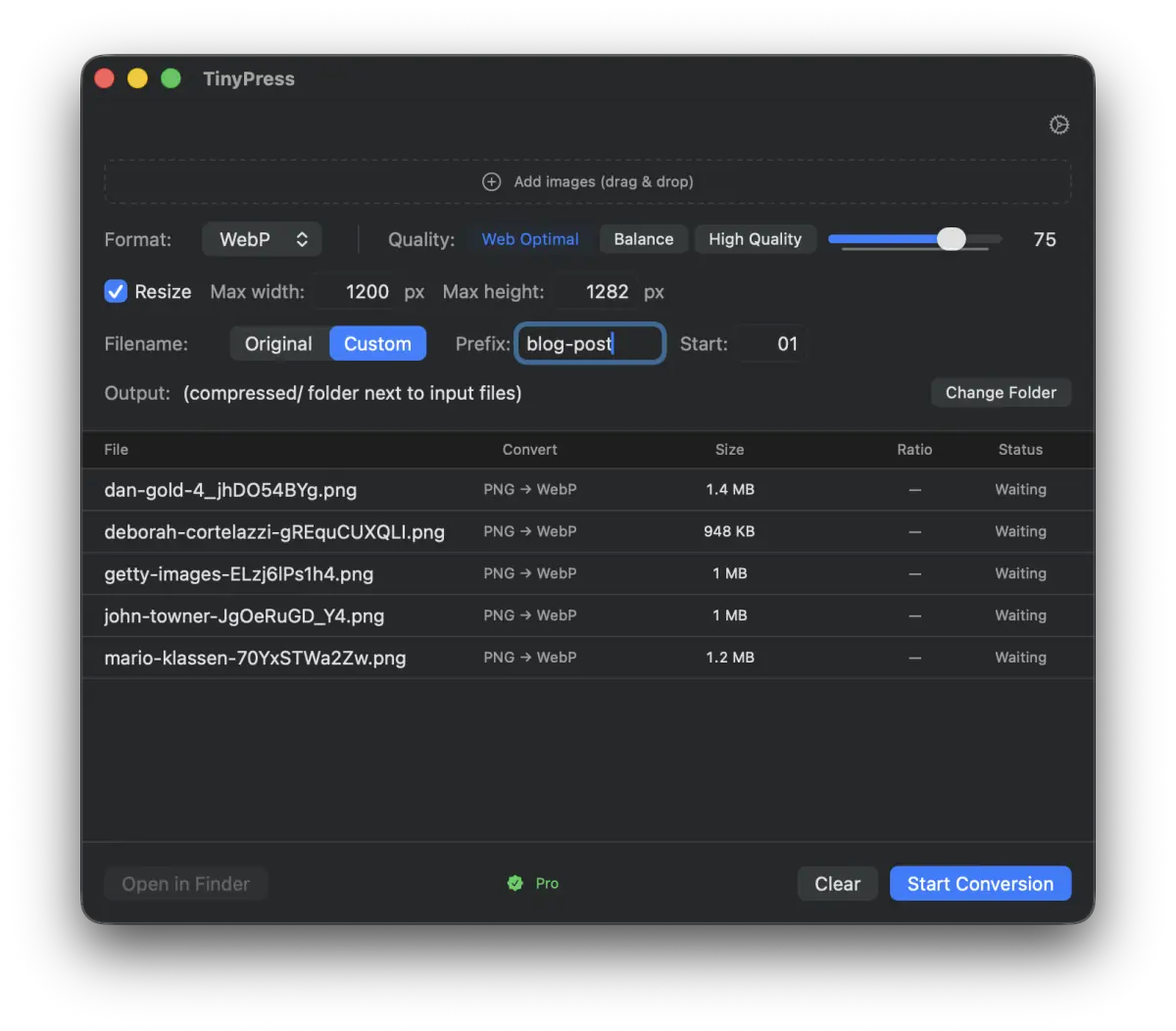 スクリーンショットで撮影した画像や Unsplash からダウンロードした写真を WebP に変換して、ファイル名を blog-post-01.webp みたいに揃えて、ついでにサイズも 1200px にリサイズして......。1枚ずつやってたら結構ストレス溜まります。