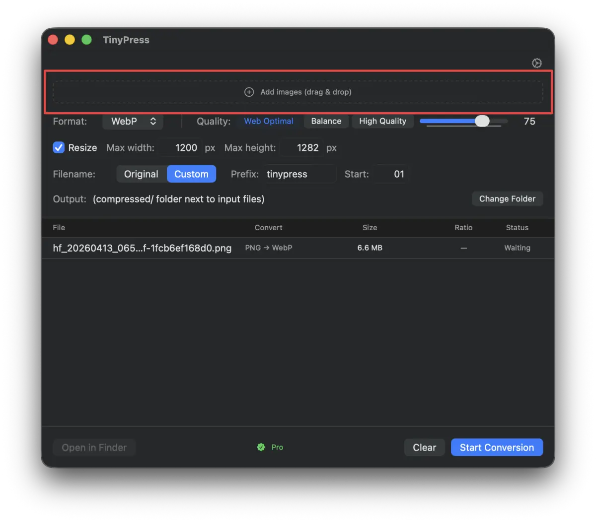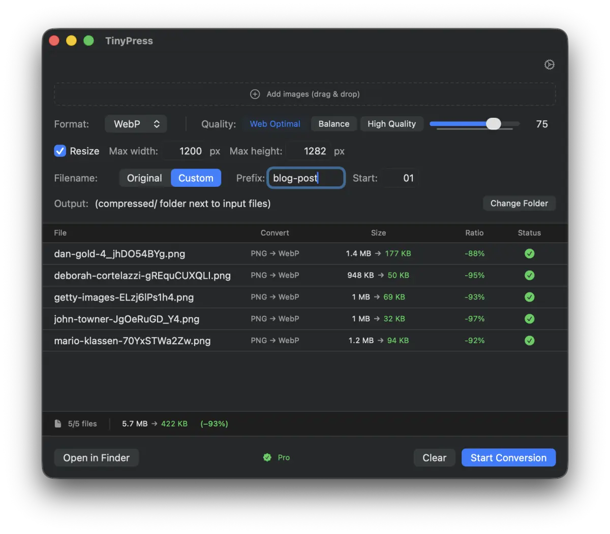 | HEIC → WebP | -92% | 25.1 MB → 1.9 MB |